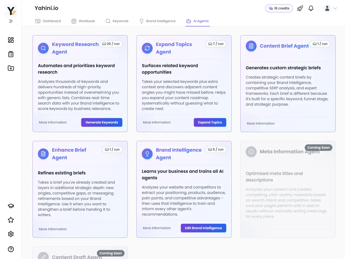 A stack of AI content agents ready to go whenever you need them. All trained on your Brand Intelligence to help with keyword research, content briefs, strategy enhancements, and more.